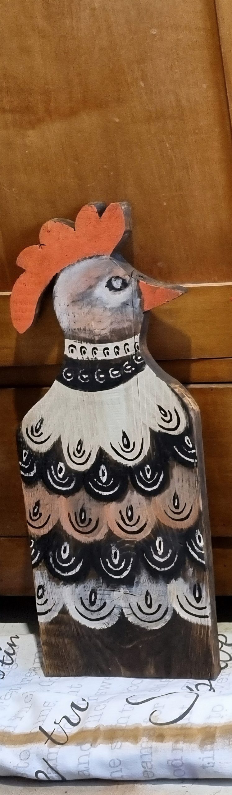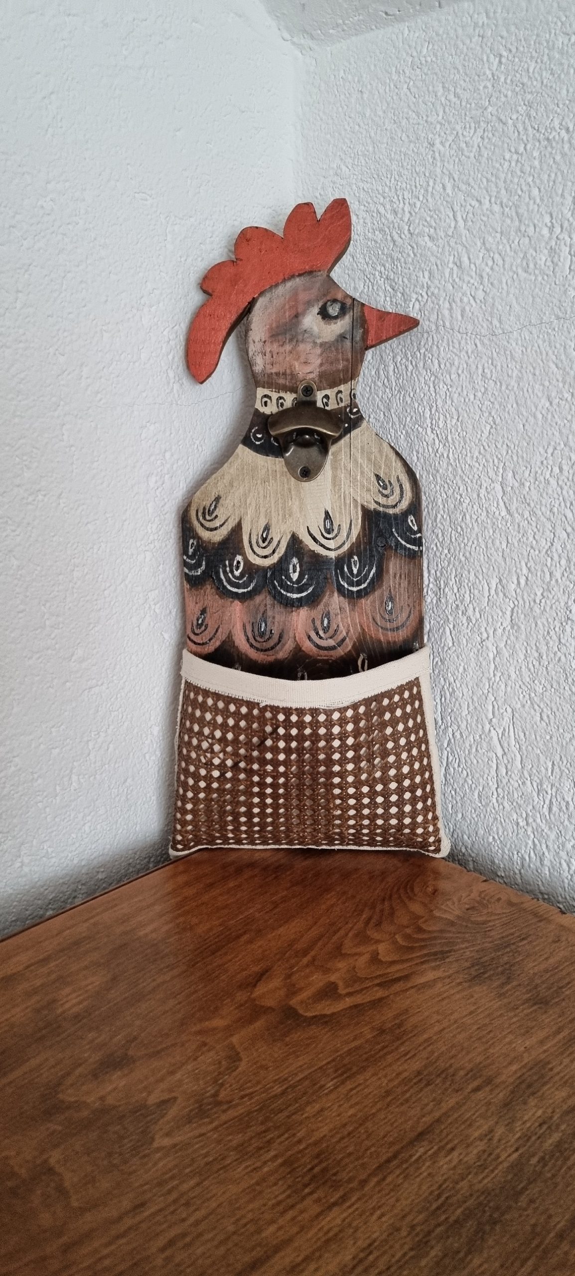Un deschizator de sticle artizanal, din lemn recuperat, in forma de cocos, pictat, cu spatiu de colectare al capacelor, din ratan, intarit cu tesatura trainica.