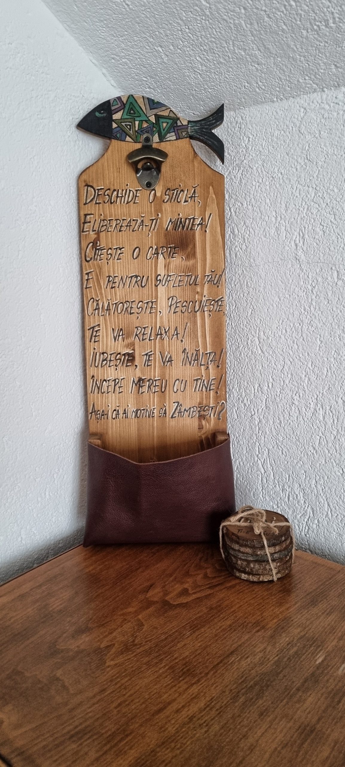 Pentru voi, el este un deschizator de sticle lucrat manual, cu un mesaj motivant, pictat, de fixat pe o suprafata fixa, prevazut cu un spatiu de colectare al capacelor, din piele naturala. Unde mai pui ca vine insotit si de un set de suporturi de pahare, din lemn, pictate?