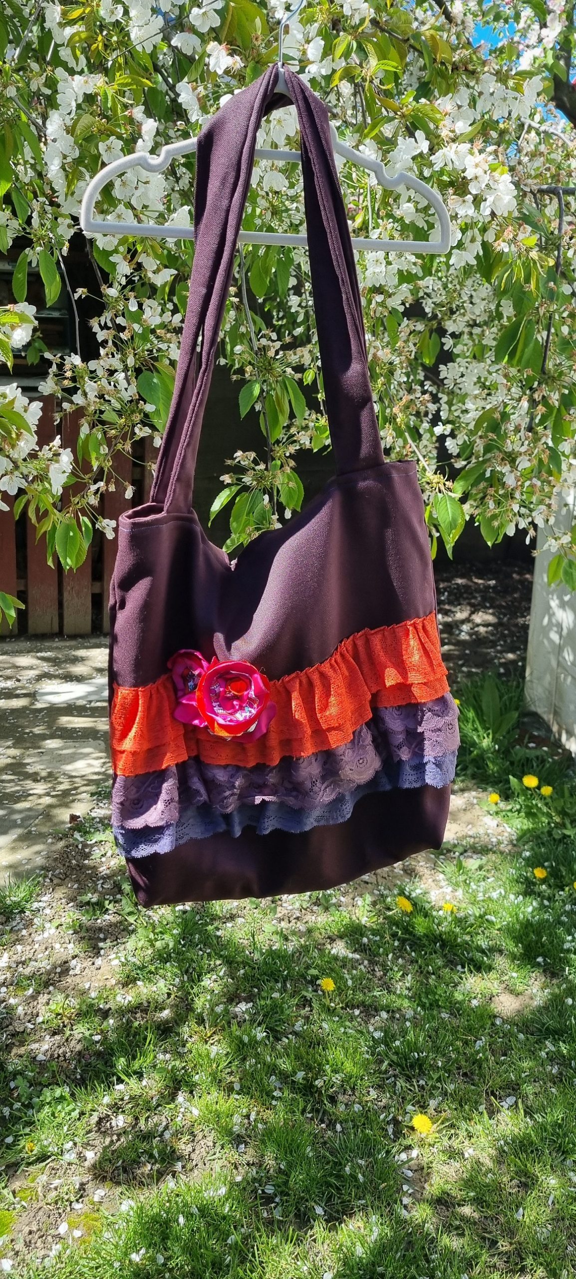 Geanta de umar, de dimensiuni generoase, cu bretele de umar si de mana, avand in interior patru buzunare incapatoare, prevazuta cu inchidere prin capsa, accesorizata cu volanase din dantela si flori din voal!