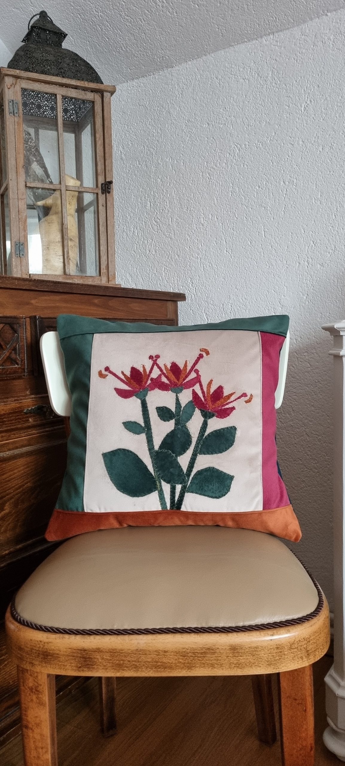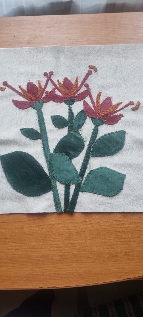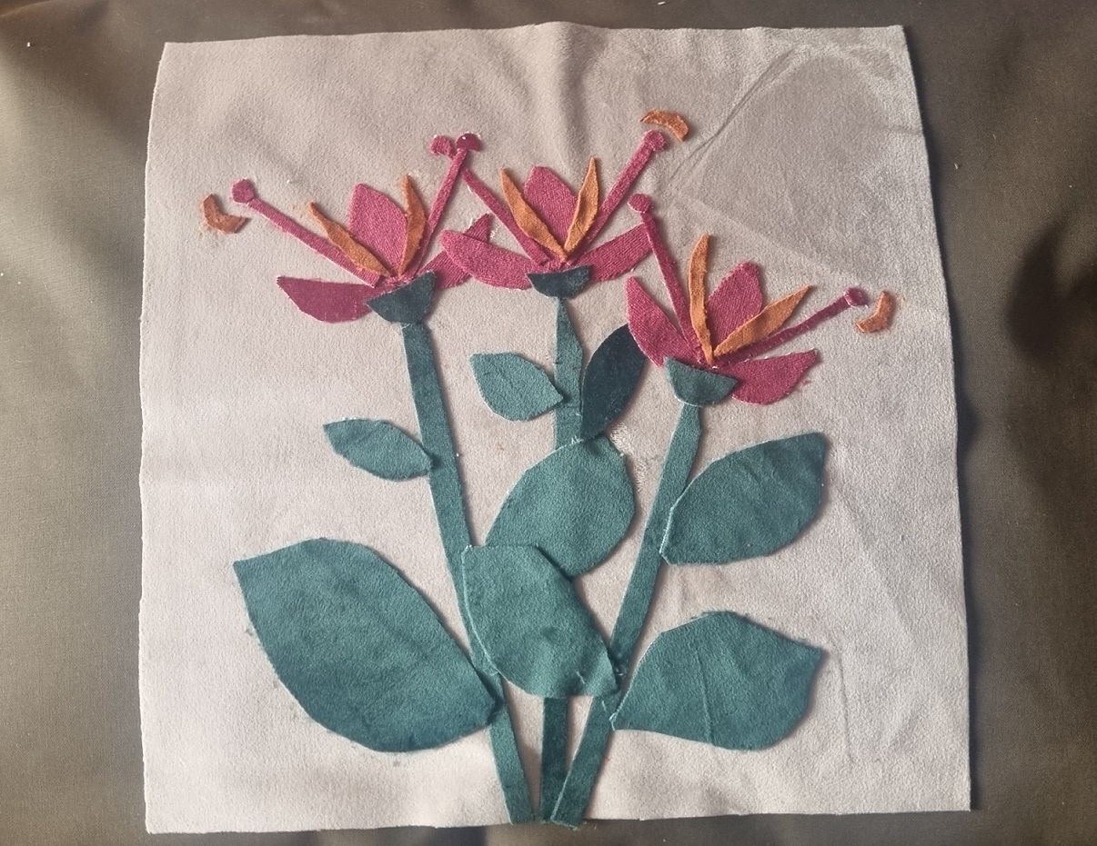 Am, o noua fata de perna decorativa, cu o floare din catifea, decupaj textil.