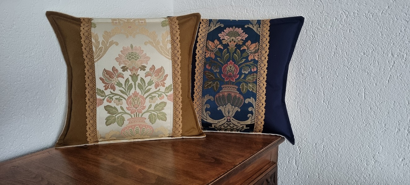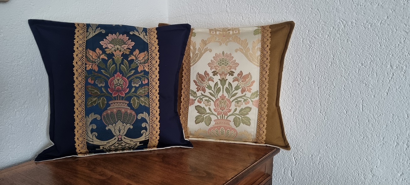 In ziua in care am lucrat acest set de doua perne decorative, am ‘umblat’ la categoria textile fine. Am gasit aceste doua bucati centrale, pe care le-am incadrat armonios, cu putina dantela nuantata pentru un plus de eleganta.