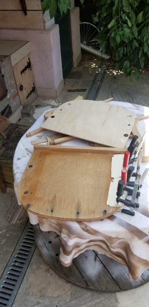 Dupa cum bine se observa, partea cea mai avariata este sezutul, sezut care nu este din lemn masiv. Am intarit cat de mult s-a putut partea existenta, insa am optat si pentru adaugarea unui nou strat, pentru un aspect mai placut.