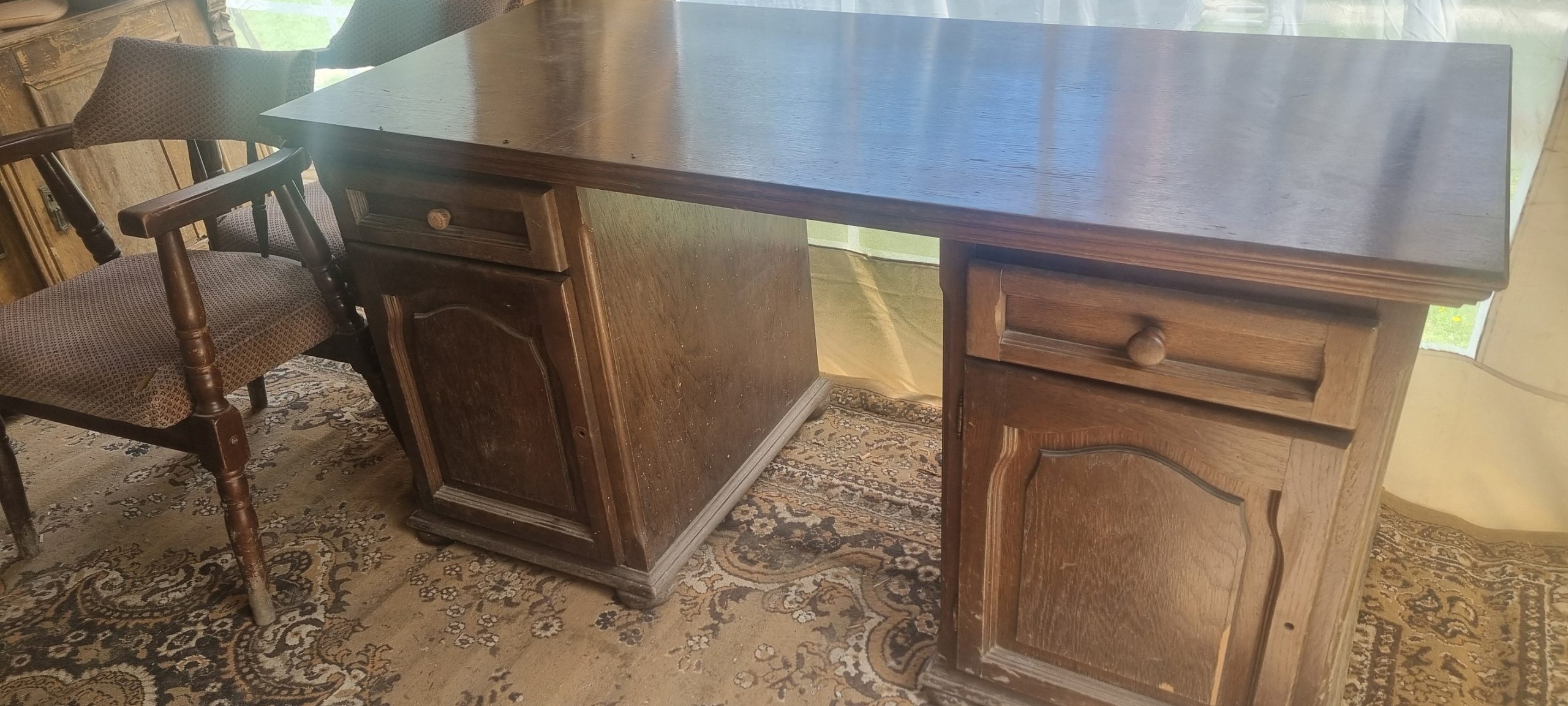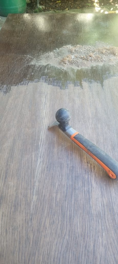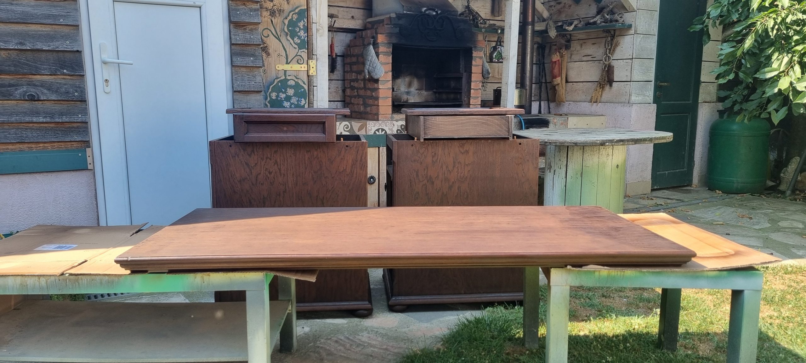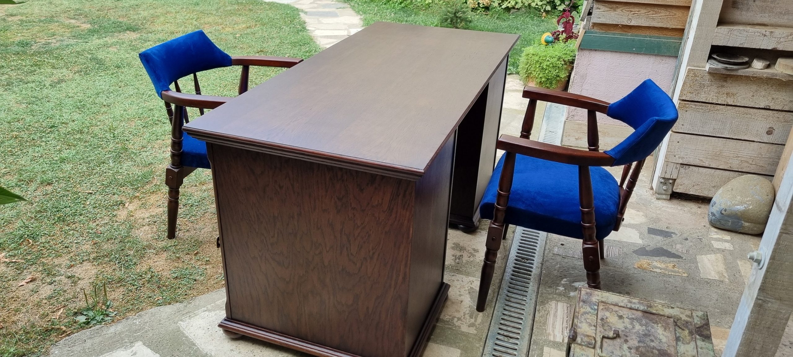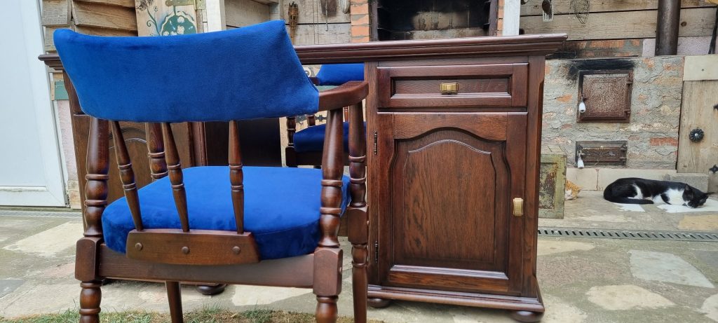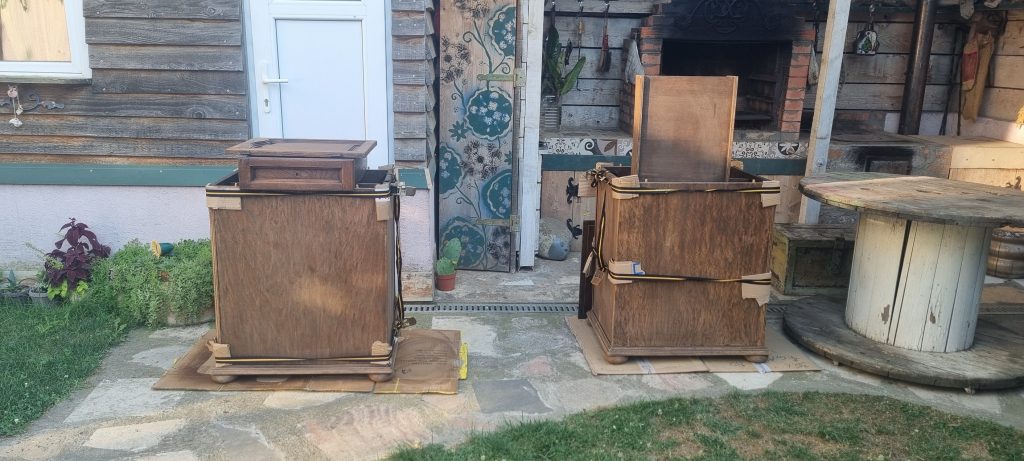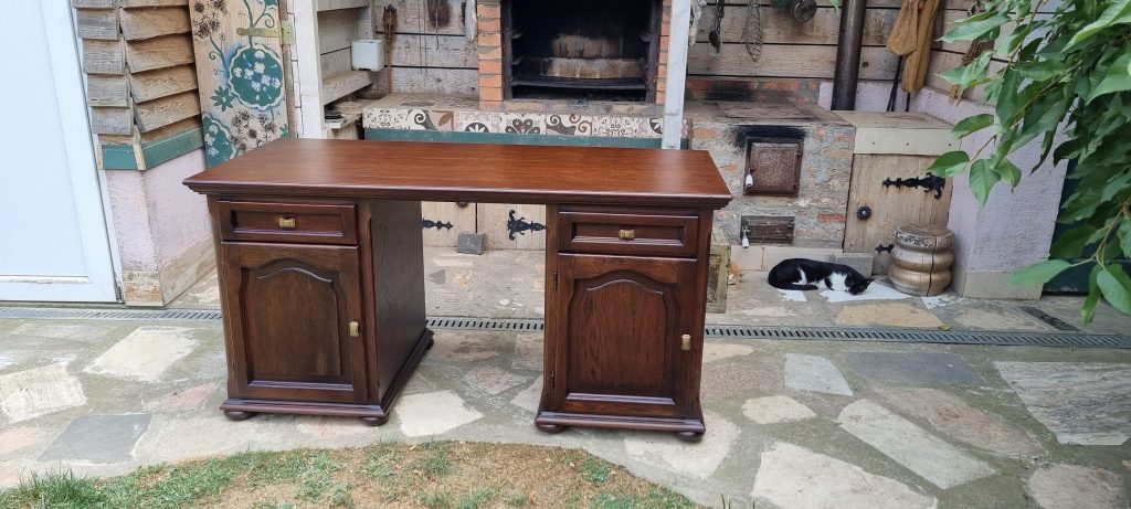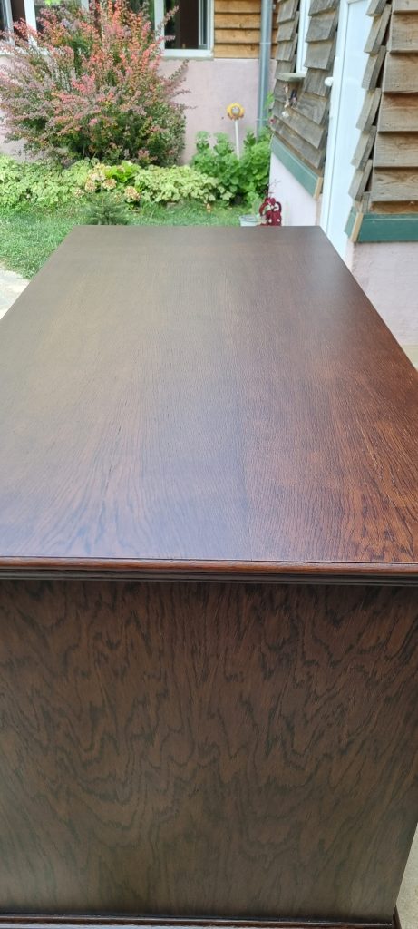 Nu aveam decat sa inlatur tot lacul existent, fara a periclita si baitul , deoarece final, aspectul trebuia sa fie destul de inchis. Curatarea s-a facut cu grija, deoarece aveam de-a face cu un lac ‘ infoiat’, pe suprafata furniruita. Dupa razuire, slefuire fina si slefuirile dintre straturile finisajului au fost cele necesare pentru obtinerea suprafetei si a aspectului dorit.