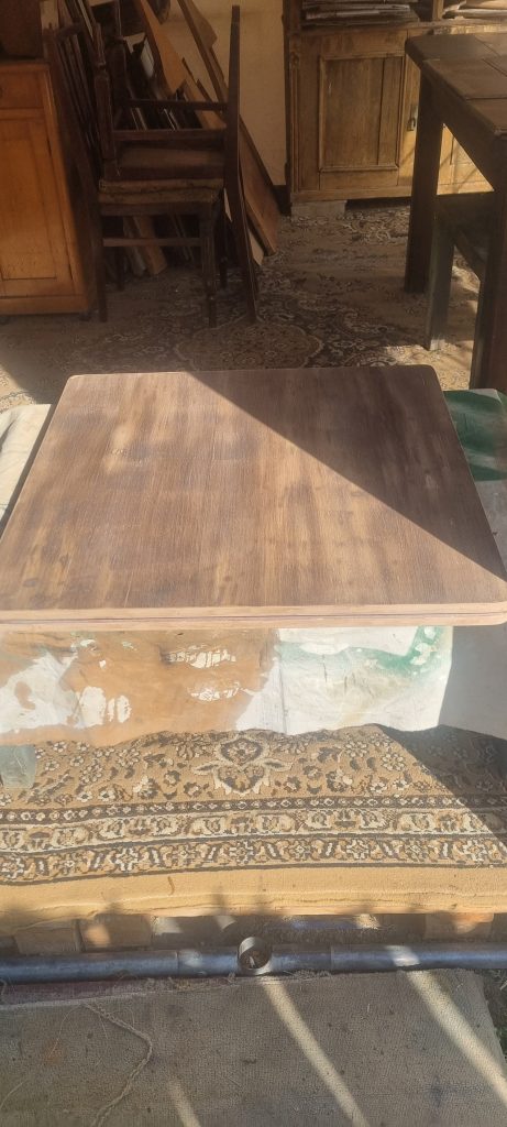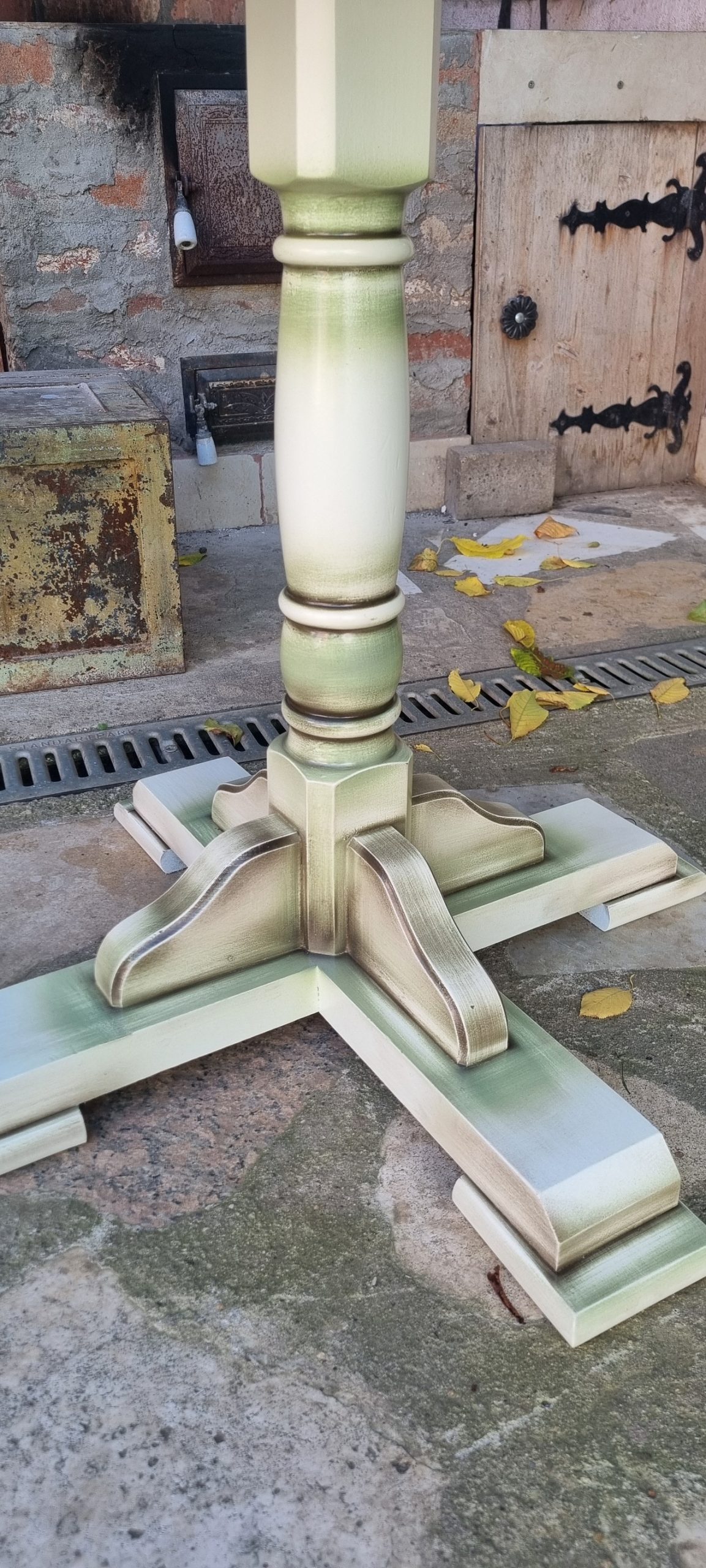 In perioada dinaintea sosirii mesei in atelier, imi tot apareau in flux lucrari foarte faine, finisate verde inchis. Na, fiind aluatul care sunt, ceva din mine nu putea sa reconditioneze aceasta masuta taman verde inchis. Am obtinut, asadar, libertatea de a reconditiona masa, in viziunea mea. Nu puteam, insa, nici ignora total atractia pentru verde a clientului….