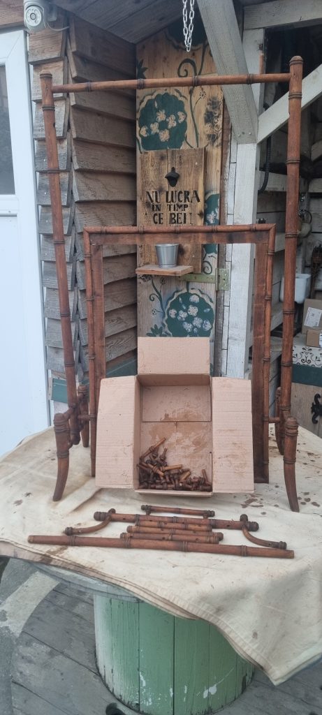 Cat timp eu am curatat cadrul si cutiuta cu titirezi, mi-au fost gata si piesele lipsa. Pentru a se armoniza in ambient, s-a dorit, totusi inchiderea nuantei cu un bait culoarea nuc.