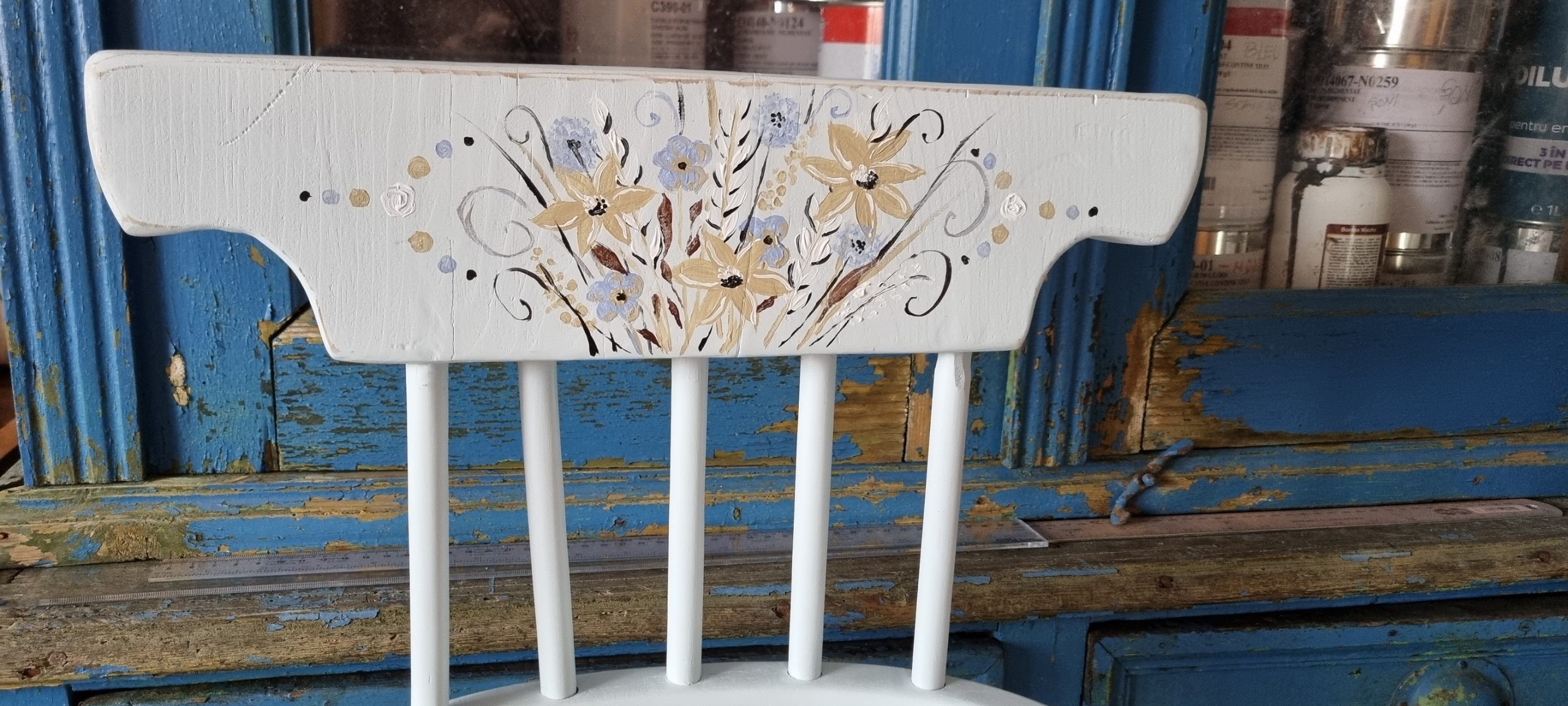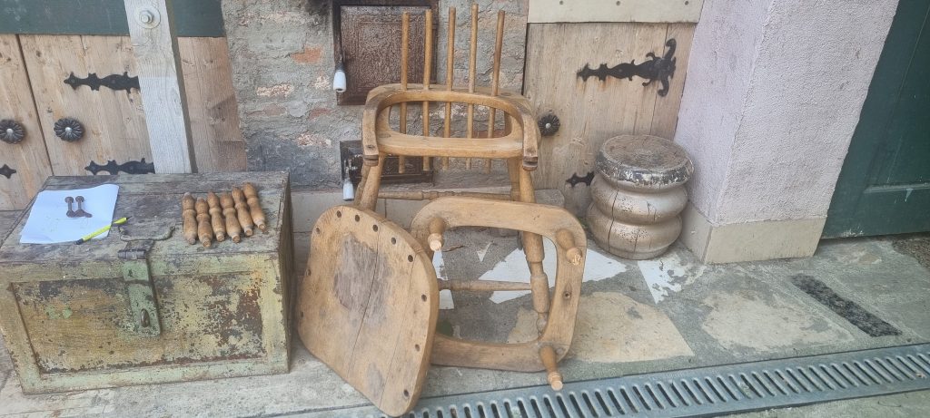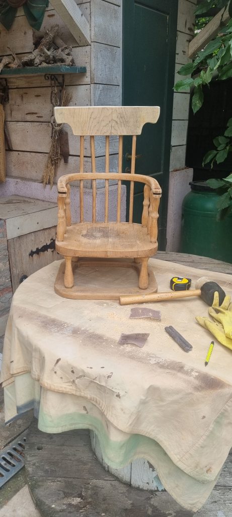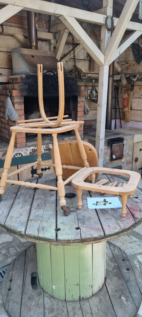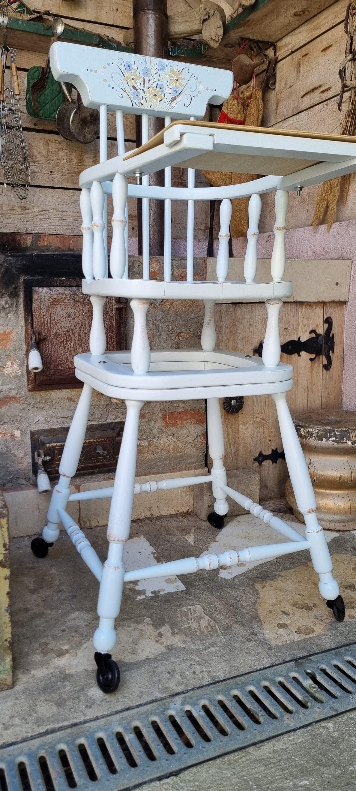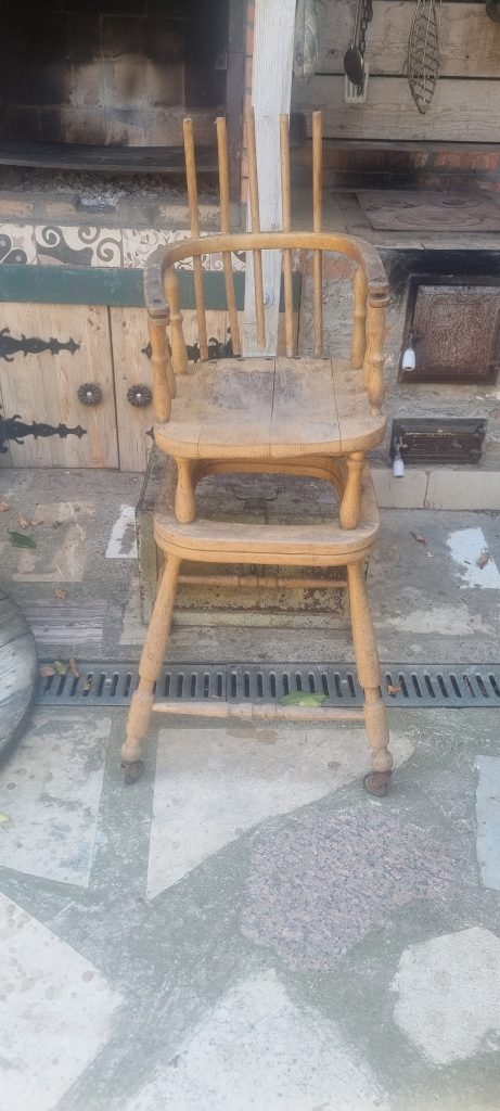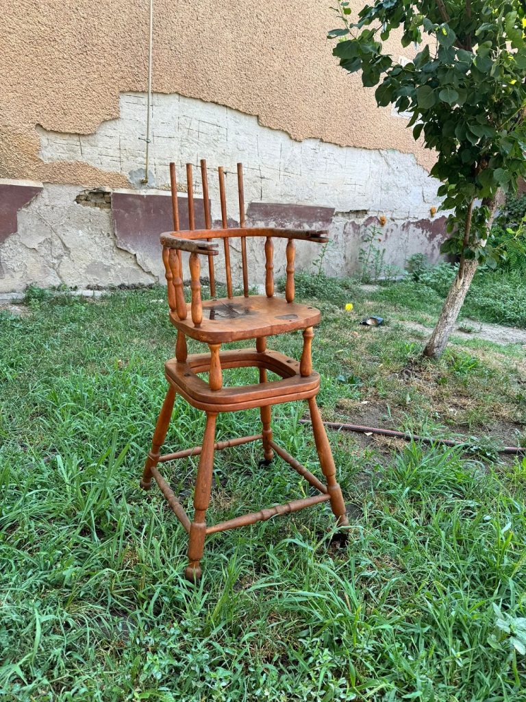Regasit in pod, folosit de cateva generatii, acest scaun de masa pentru copii a venit la pachet cu propria lui poveste, insa a ajuns ‘ciont’. Ultimul element gasit nu a fost intocmai cel pe care eu speram sa-l gaseasca – spatarul, ci o parte mica strunjita, componenta a sustinerii.
