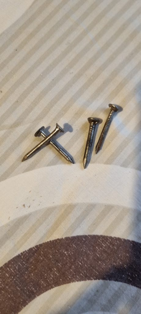 Tinand cont de faptul ca am rezistat tentatiei de a nu taia niturile de prindere originale, la fixarea sezutului era imperios necesar sa folosim aceleasi cuie, zdravene, de altfel, sub usorul strat de rugina.