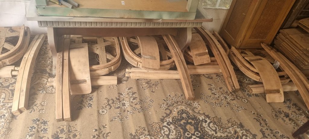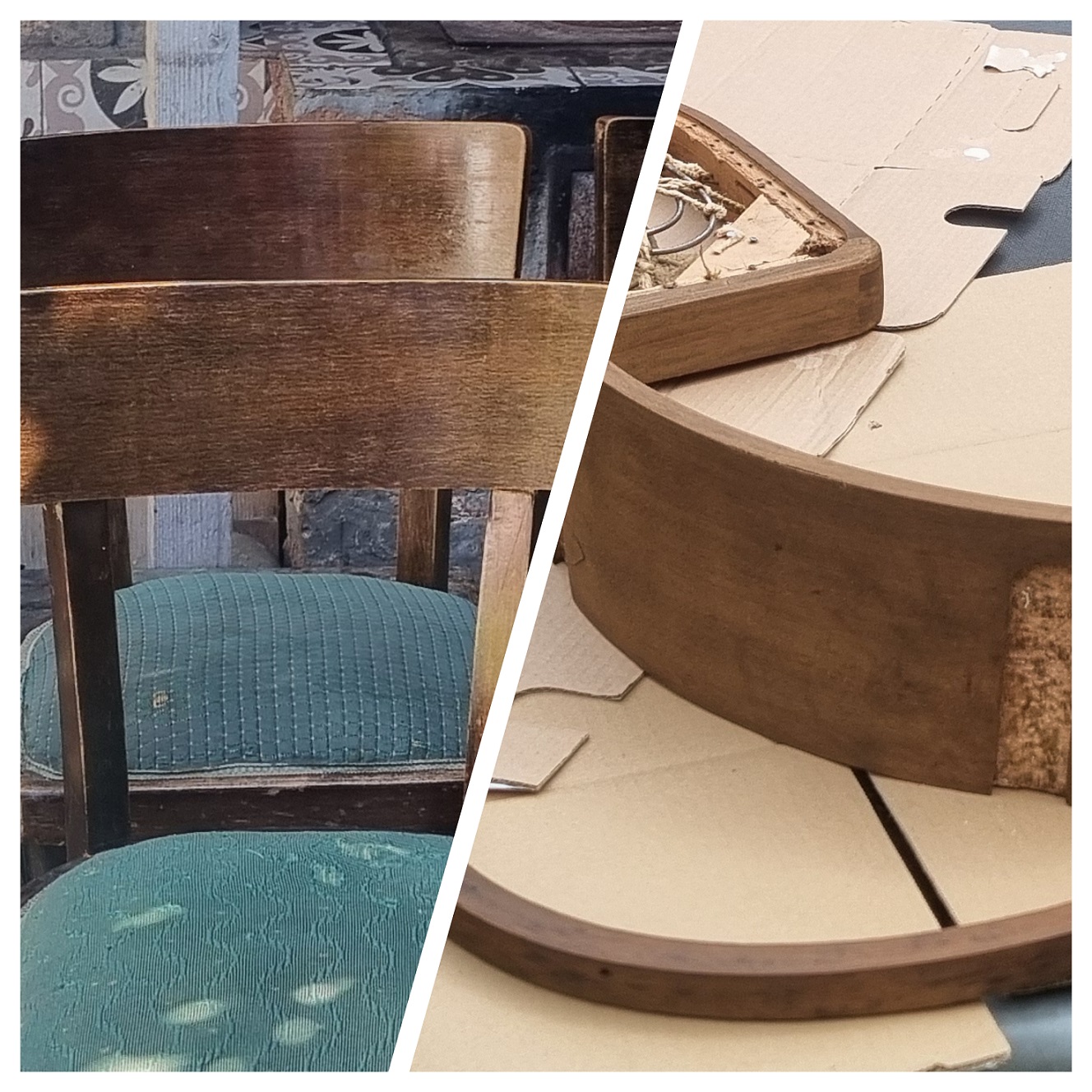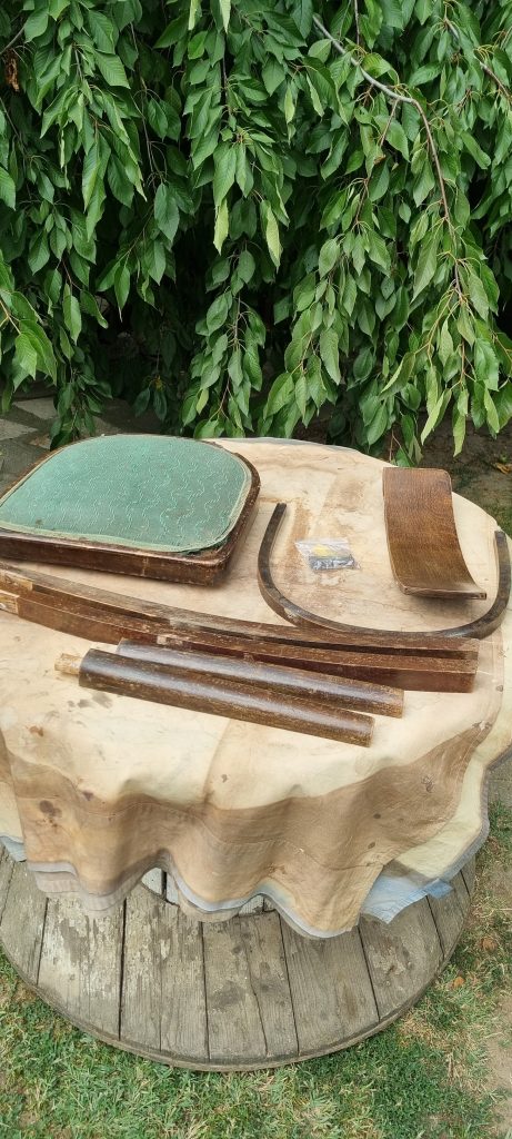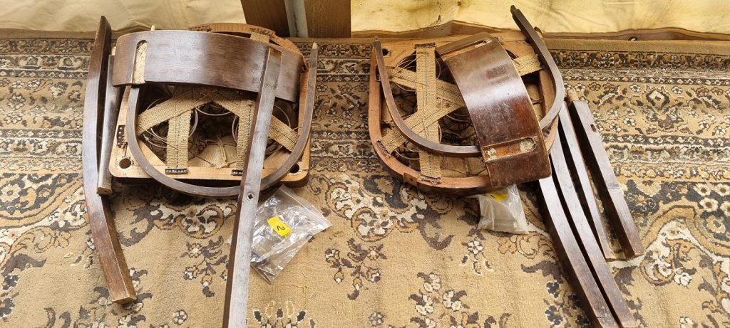 Cât timp eu ‘ mi-am făcut mendrele’ cu elementele scaunelor, șezuturile au făcut o vizită în atelierul de tapițerie unde au fost refăcute legăturile arcurilor și întărite structural.