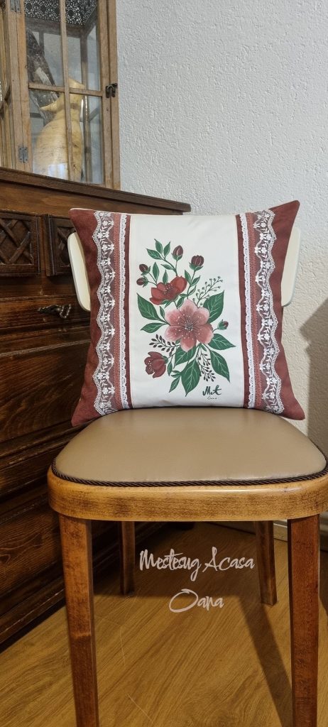 De la pasari….la ce puteam trece imediat, daca nu la flori???? O floare roz am conturat, Repede am si pictat! Dupa ce ea s-a uscat Decorul i l-am adaugat! Dantelute delicate, Panglici mici si colorate, Doar cu grija asezate! Sa rezulte-o perna faina, Lucrata cu drag, in taina!